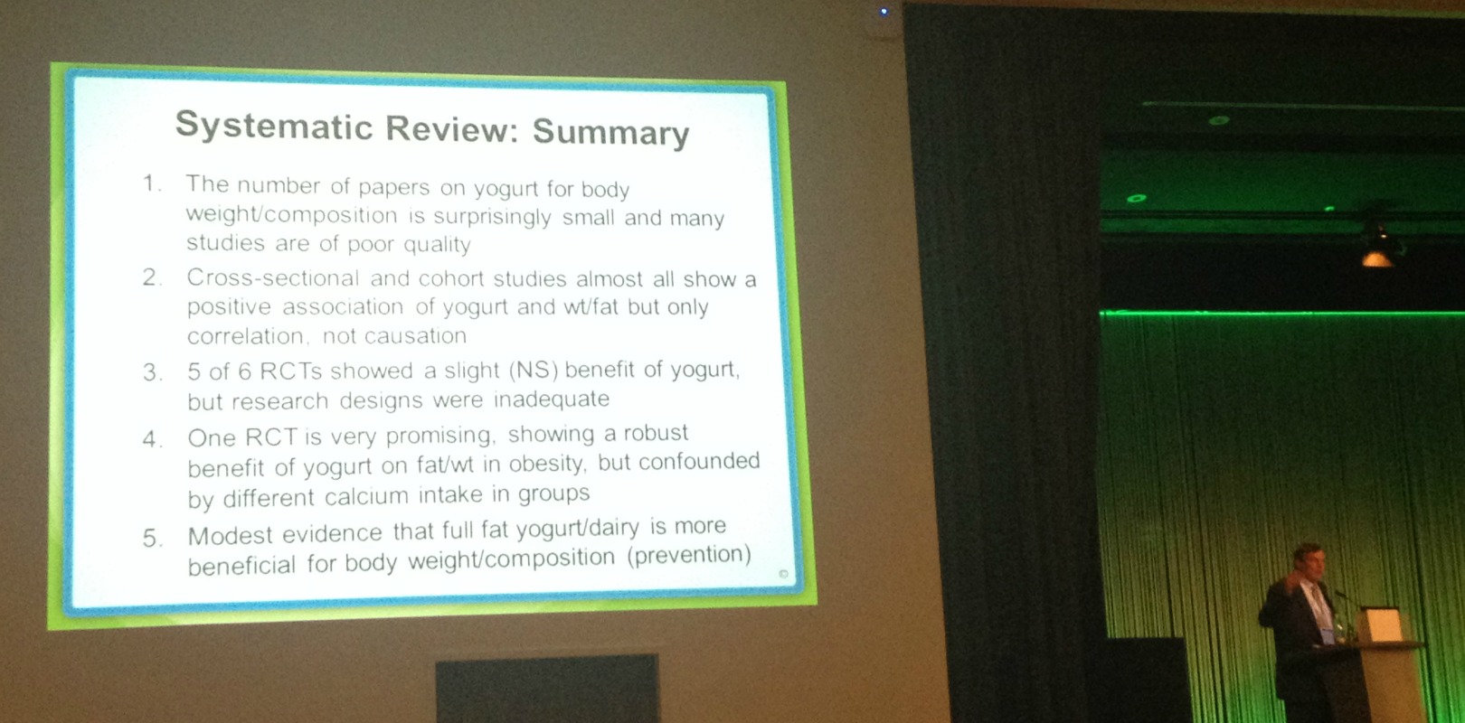 - Dr. Angelo Tremblay (PhD at the Department of Kinesiology, Laval University, Canada) presented an overview of key findings from observational cohort studies conducted on different continents (North & South America and Europe). His study results suggest that yogurt consumption is associated with an improved diet quality.